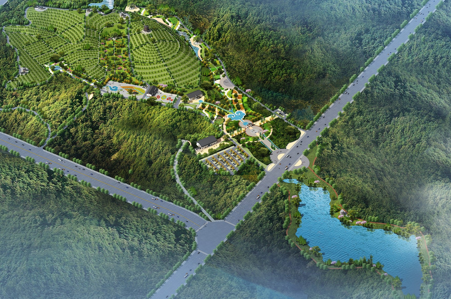 德龍陵園來龍于昆侖山系,屬翠峰山主脈延伸到石馬龍山的團(tuán)山結(jié)穴而建,面朝小閘水庫,太和山與寥廓山左右環(huán)抱,園區(qū)巒聳翠、水映霞輝、山環(huán)水繞、郁郁蔥蔥,有五龍捧圣之勢,冠以五福臨門之愿,五德傳承之感,使山水人文融為一體,是弘揚(yáng)中華文化的教研基地。