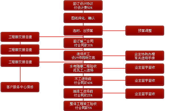 1.前期設計 -- 2.主體拆改 -- 3.水電改造 -- 4.木工 -- 5.貼磚 -- 6.刷墻面漆 -- 7.熱水器安裝 -- 8.廚衛(wèi)吊頂 -- 9.櫥柜安裝-- 10.煙機灶安裝 -- 11.木門安裝 -- 12.地板安裝 -- 13.鋪貼壁紙 -- 14. 開關插座安裝 -- 15.燈具安裝 -- 16.五金潔具安裝 -- 17.窗簾桿安裝 -- 18.拓荒保潔 -- 19.家具進場 -- 20.家電安裝 -- 21.家居配飾