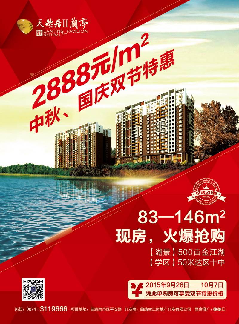 •     時(shí)至中秋、國(guó)慶雙節(jié)同慶,天然居Ⅱ蘭亭將于2015年9月26日至10月7日雙節(jié)期間傾情推出2888元/m²,不限戶型、樓層(僅限20套房源)的購(gòu)房?jī)?yōu)惠活動(dòng),房源有限,先到先得!